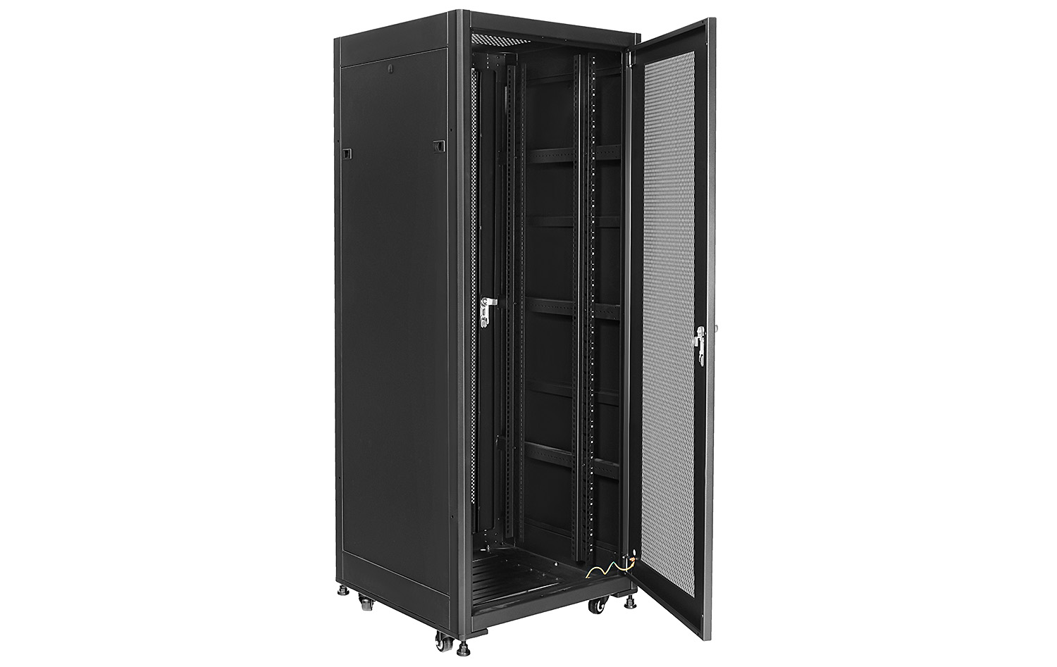 Přední dveře jsou vyrobeny z vysoce kvalitního perforovaného kovu. Perforované dveře zvyšují mechanickou odolnost skříně a mají pozitivní vliv na cirkulaci vzduchu v jejím vnitřku. Ostatní stěny jsou vyrobeny z práškově lakovaného plechu, díky čemuž je skříň odolná proti korozi, oxidaci a oděru laku. Boční panely lze sejmout (dveře na západku), což umožňuje ještě lepší přístup k zařízením. Zadní dveře lze také zamykat na klíč, což zvyšuje bezpečnost zařízení namontovaných ve skříni. Stojící skříň RACK byla navržena tak, aby bylo možné namontovat dveře na levou nebo pravou stranu. Skříň nabízí různé možnosti vedení kabelů (nahoře, dole).