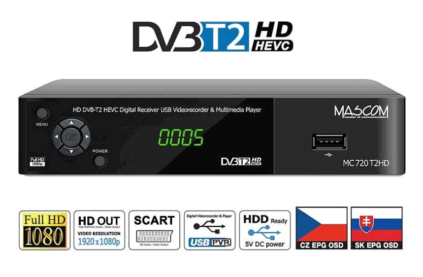Příjem DVB-T / DVB-T2 vysílání, kodek HEVC H.265 v SD i HD rozlišení