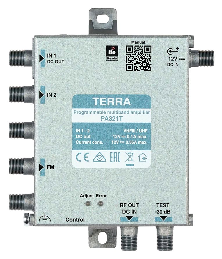 Programovatelný kanálový zesilovač PA420T od společnosti TERRA byl navržen pro příjem digitální pozemní televize (DVB-T/T2) ve vícepatrových budovách, rezidencích, hotelech, penzionech, školách, nemocnicích atd. Zesilovač lze použít jako prvek zesilující