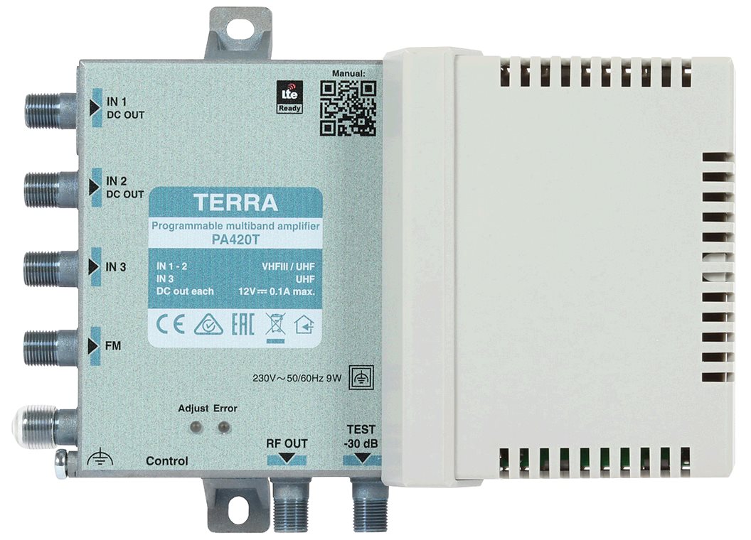Programovatelný kanálový zesilovač PA321TP od společnosti TERRA byl navržen pro příjem digitální pozemní televize (DVB-T/T2) ve vícepatrových budovách, rezidencích, hotelech, penzionech, školách, nemocnicích atd. Zesilovač lze použít jako prvek zesilující