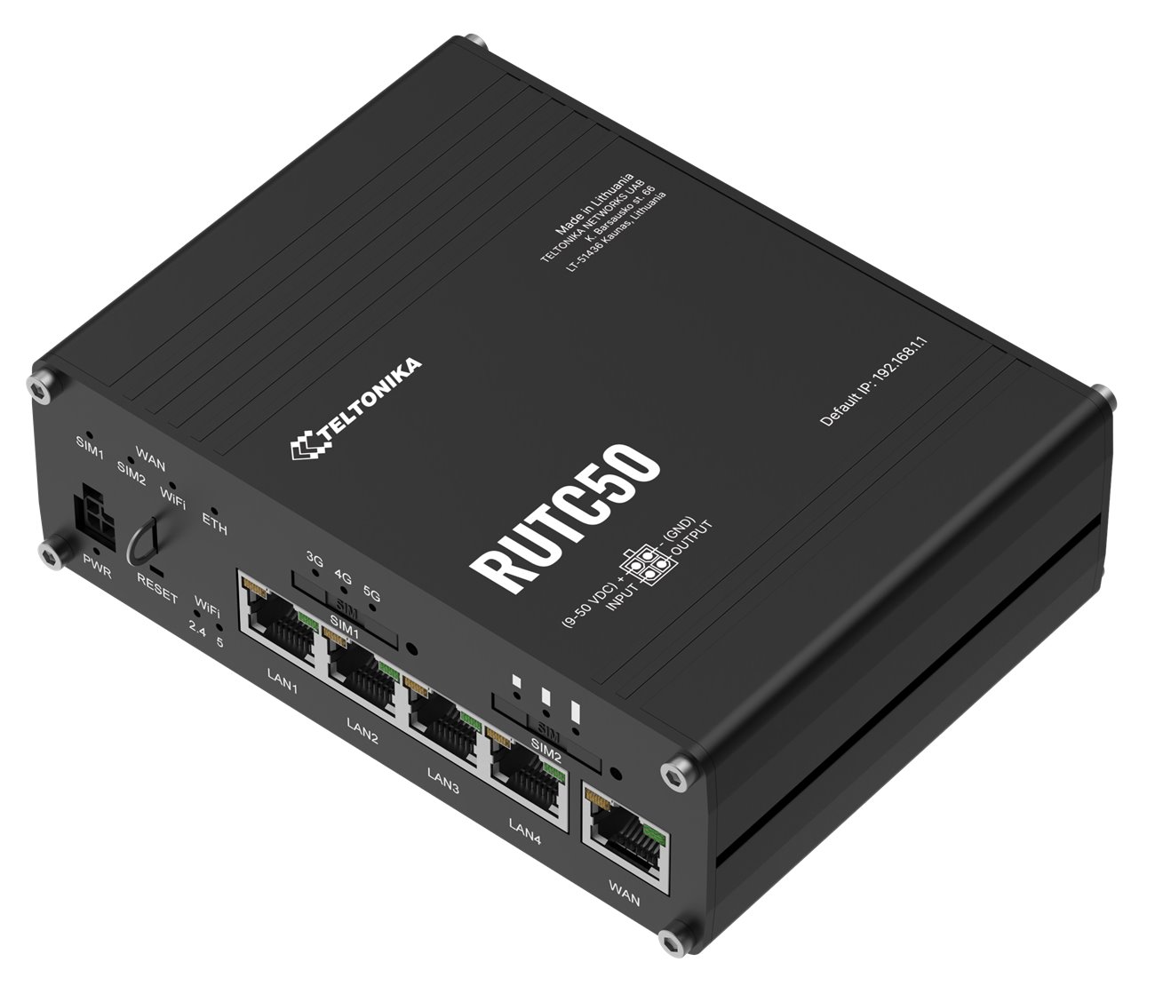 Teltonika RUTC50 je robustní průmyslový router, který nabízí 5G mobilní komunikaci pro vysokorychlostní a datově náročné aplikace. Mobilní komunikace 5G s možností dual SIM konfigurace je kombinovaná s 5 porty Gigabit Ethernet a Wi-Fi 6, umožňuje spolehlivý přenos dat s ultra nízkou latencí.