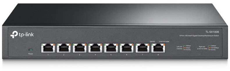 Firma TP-Link přichází s novou řadou 10-Gigabitových switchů, které dokážou navázat až 10Gbps link na každém portu. Tento model TL-SX1008 bez managementu v kovovém desktop / rackmount (19") šasi má celkově 8 metalických portů, které dokáží navázat link s rychlostí 100M / 1G / 2.5G / 5G / 10Gbps, indikační LED na každém portu a jeden 230V AC konektor pro napájení switche na zadní straně. Switch je velmi robustní a je vybaven jedním ventilátorem s automaticky nastavitelnou rychlostí otáček.
