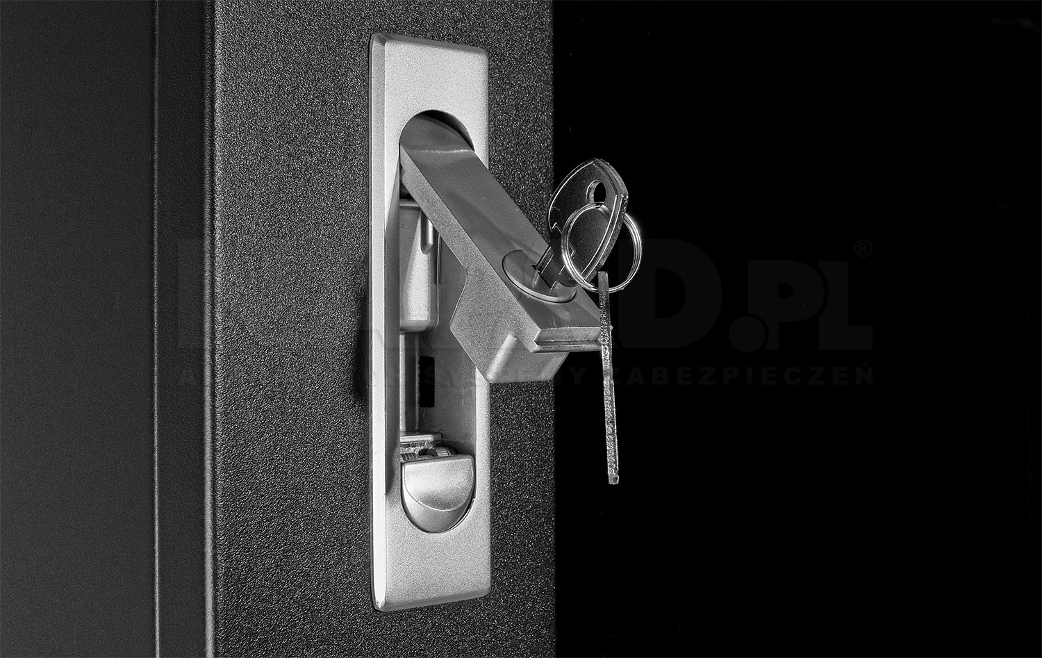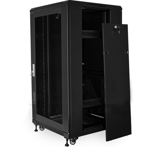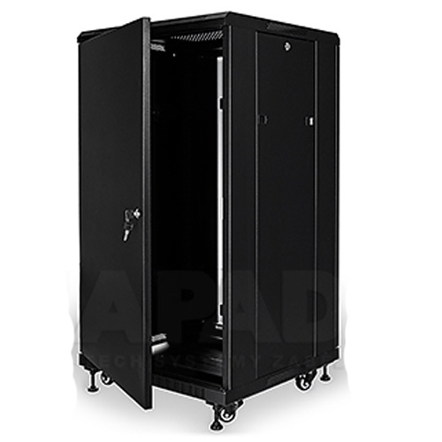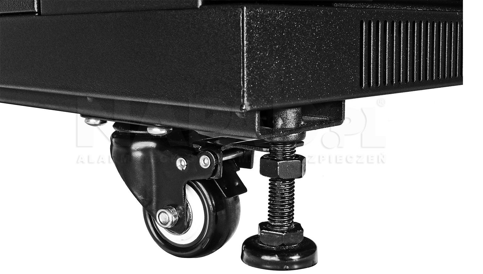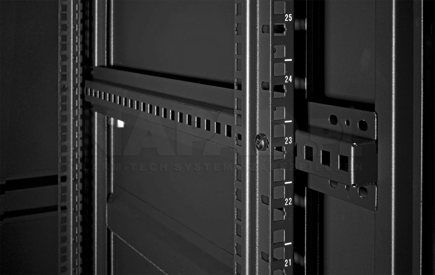 Přední a zadní dveře jsou vyrobeny z vysoce kvalitního perforovaného kovu, což zvyšuje mechanickou odolnost skříně a má pozitivní vliv na cirkulaci vzduchu v jejím vnitřku. Ostatní stěny jsou vyrobeny z práškově lakovaného plechu, díky čemuž je skříň odolná proti korozi, oxidaci a oděru laku. Boční panely lze sejmout (dveře na západku), což umožňuje ještě lepší přístup k zařízením. Lze je také zamknout na klíč, což zvyšuje bezpečnost zařízení namontovaných ve skříni. Zadní dveře lze také zamykat na klíč. Stojící skříň RACK byla navržena tak, aby bylo možné namontovat dveře na levou nebo pravou stranu. Skříň nabízí různé možnosti vedení kabelů (nahoře, dole).
