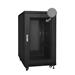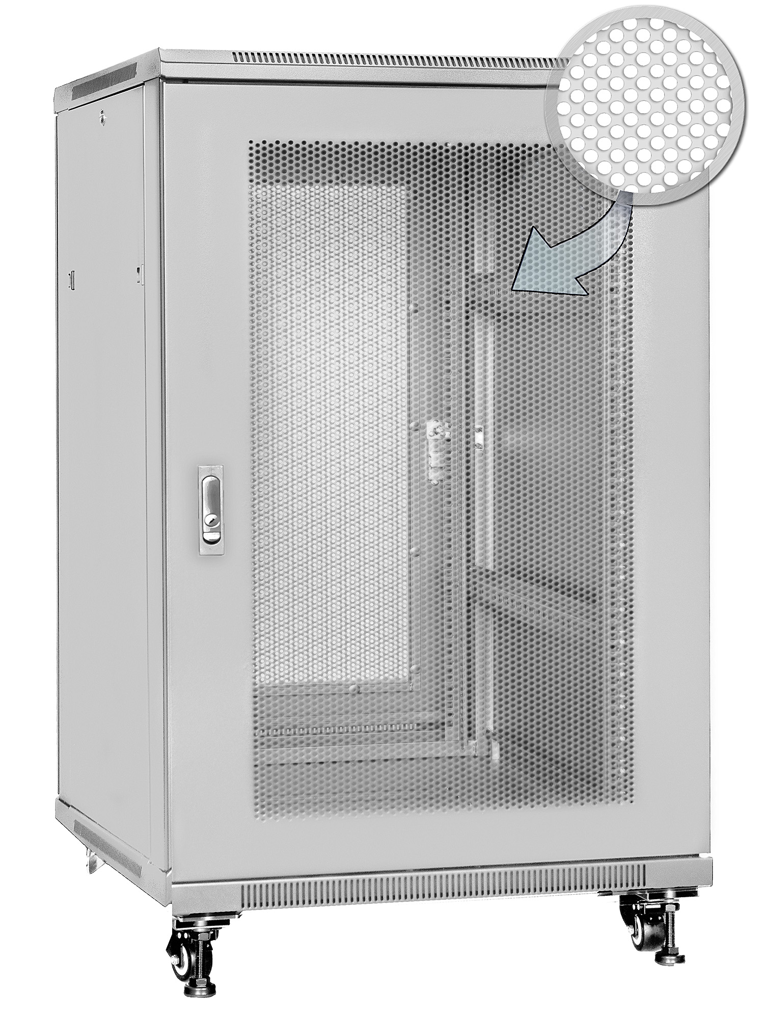 Přední a zadní dveře jsou vyrobeny z vysoce kvalitního perforovaného kovu, což zvyšuje mechanickou odolnost skříně a má pozitivní vliv na cirkulaci vzduchu v jejím vnitřku. Ostatní stěny jsou vyrobeny z práškově lakovaného plechu, díky čemuž je skříň odolná proti korozi, oxidaci a oděru laku. Boční panely lze sejmout (dveře na západku), což umožňuje ještě lepší přístup k zařízením. Lze je také zamknout na klíč, což zvyšuje bezpečnost zařízení namontovaných ve skříni. Zadní dveře lze také zamykat na klíč. Stojící skříň RACK byla navržena tak, aby bylo možné namontovat dveře na levou nebo pravou stranu. Skříň nabízí různé možnosti vedení kabelů (nahoře, dole).