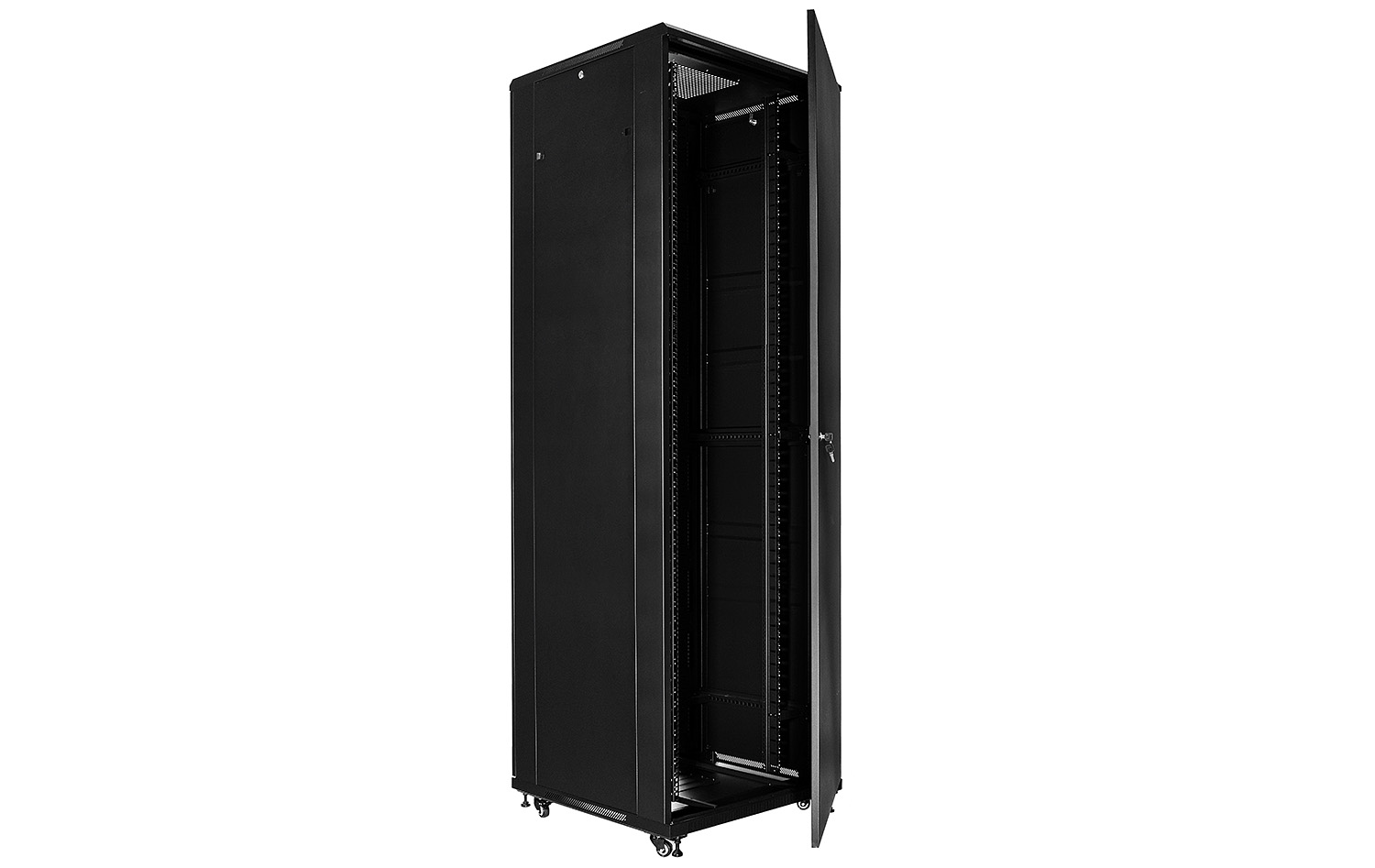 Přední dveře jsou vyrobeny z tvrzeného skla, které zvyšují jeho mechanickou pevnost a tepelnou stabilitu. Zbytek stěn jsou vyrobeny z barevně lakovaného plechu, takže je odolný vůči korozi, oxidaci a odstranění barvy. Boční stěny mohou být odstraněny (zacvakávání), což vznikne ještě větší přístup k zařízení. Mohou být také uzamčeny, což zvyšuje bezpečnost zařízení instalovaných v rozvaděči. Je zde také možnost odemikání a zamikání na klíč zadních dveří. Pojízdná racková skříň je navržen tak, aby dveře bylo možné namontovat vlevo nebo vpravo. Ve skříni existují různé možnosti pro vstup kabelů (nahoře, dole).