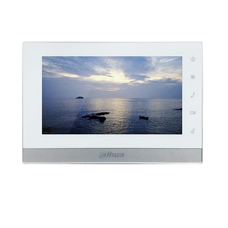 IP Dahua handsfree videomonitor, provedení bílý plast, 7" barevný dotykový LCD displej s rozlišením 800x480, H264 komprese, TCP / IP komunikace, grafické menu, dotyková tlačítka, možnost automatického záznamu obrázků po zazvonění nebo videa při zanechání vzkazu po vložení micro SD karty (není součástí balení), interkom v rámci více monitorů v bytě (max.6 monitorů), připojitelnost až 20 dveřních jednotek a 8 ks externích CCTV Dahu IP kamer, podpora přenosu video hovoru / push notifikace na Android a iOS smartfony přes internet (aplikace gDMSS Plus nebo iDMSS Plus), 1x RJ45 konektor pro připojení do sítě, 6x NO kontakt pro připojení alarmových vstupů - funkce EZS ústředny, 1x NO alarmový výstup, ovládání 1 zámku, přizvonění od dveří, napájení externím zdrojem 12VDC / 600mA (zdroj není součástí balení), nebo Dahua PoE switchem (pro napájení není možné použít standardní typ PoE switche), montáž na povrch, rozměry 200x136x21mm, interiérové použití