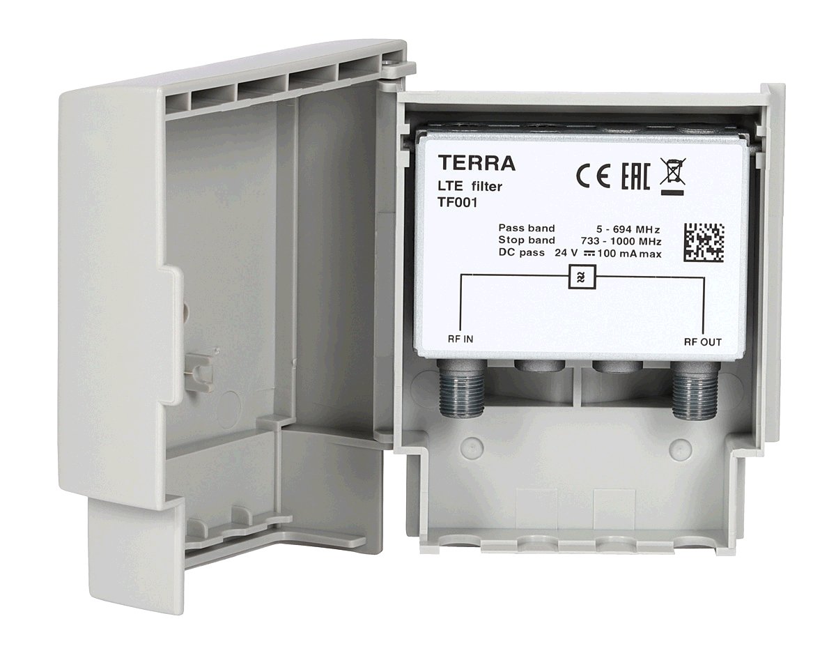 Terra TF007A je pásmový filtr určený k potlačení LTE700 pásma. Filtr je umistěn v Zamak odlitku s F konektory. Filtr je určen pro montáž do venkovního prostředí. Filtr je průchozí pro signály v pásmu 5-240 MHz a 470-694 MHz. Filtr je průchozí pro napájení