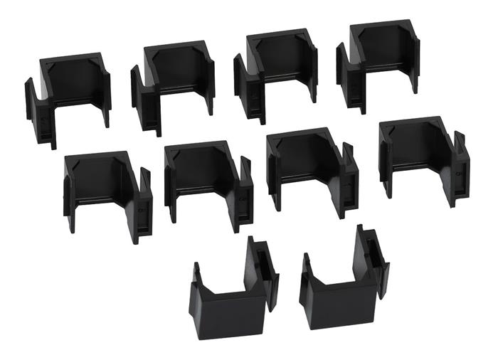 Černá záslepka typu keystone, určená k vyplnění volných míst v propojovacích (patch) panelech, nástěnných zásuvkách a pouzdrech kompatibilních se standardem keystone.
