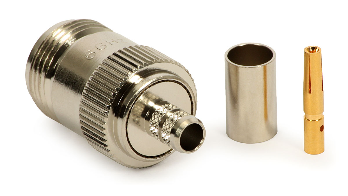Konektor N female krimpl. je určen na kabely H155 nebo RF240. Konektor se nejčastěji používá pro připojení bleskojistky na 5GHz a pigtailů. Pozor, tento konektor nelze přidělat na kabely Belden H1000, RG58, LX195, C195 ani H125! Konektor je krimplovací a