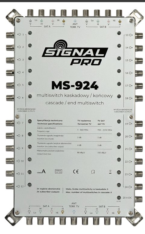 Multiswitch MS-932 SIGNAL PRO 9/32 je určen pro hromadné instalace RTV-SAT. • 9 vstupů (8×SAT, 1×TERR) • 32 nezávislých výstupů pro účastníky • Průchozí konstrukce (možnost kaskádování) • Velmi dobré impedanční přizpůsobení (IRL > 21 dB) • Lité pouzd