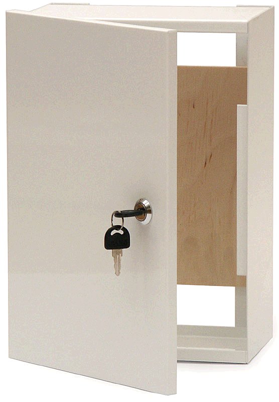 Montážní plechová skříň s dřevěným dnem, uzamykatelná, závěsná, určená pro ochranu a zabezpečení zařízení SAT, TV, FM a WIFI, LAN prvků. Přívod kabelu do skříně zajišťují na horní a dolní straně asi 15mm široká drážka po celé délce Materiál skříně je chráněn galvanickým zinkem proti korozi a povrchově je upravena bílým lakem.
