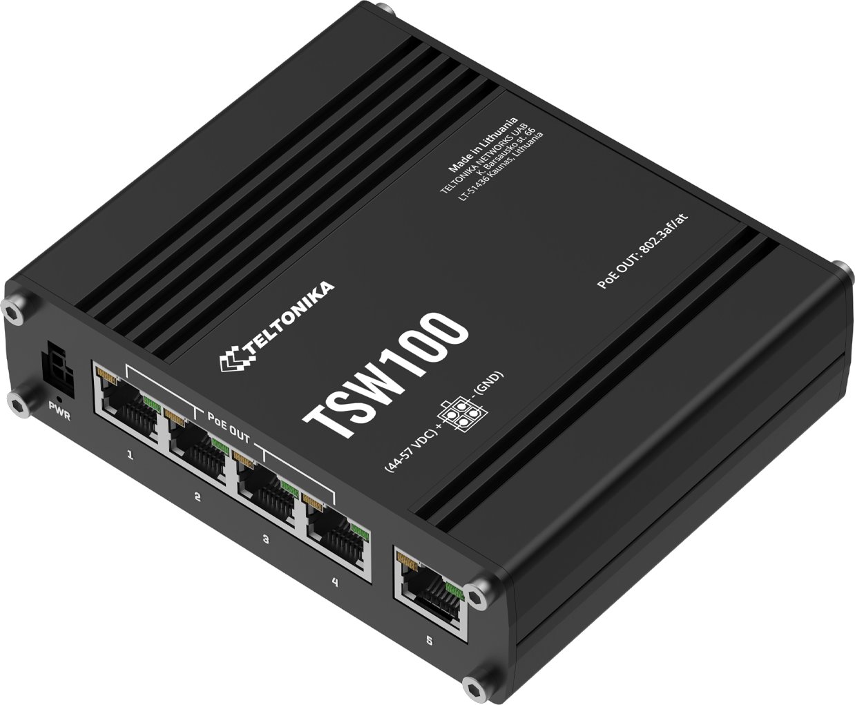 TSW100 je první průmyslový switch od Teltonika Networks bez managementu. Nabízí pět gigabitových portů z nichž jsou čtyři PoE out 802.3af a 802.3at.