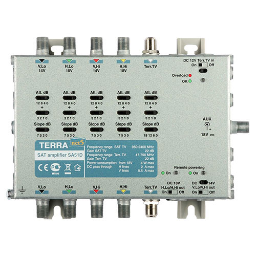 Zesilovač Terra SA-911 je navržen pro zesílení signálů z 2x QUATTRO konvertoru a a terestrického vstupu. Použití tohoto zesilovače je určeno pro budování distribučních sítí za použití multiswitch přepínačů. Tento zesilovač umožňuje taktéž distribuovaně na