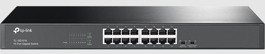 TP-Link TL-SG1016 je gigabitový switch s kapacitou přepínání 32Gbps a (16) 1Gbit porty. Využívá pasivní chlazení, takže nabízí zcela bezhlučný provoz vhodný pro kancelářské prostředí. Maximální spotřeba energie zařízení je 10,7W.